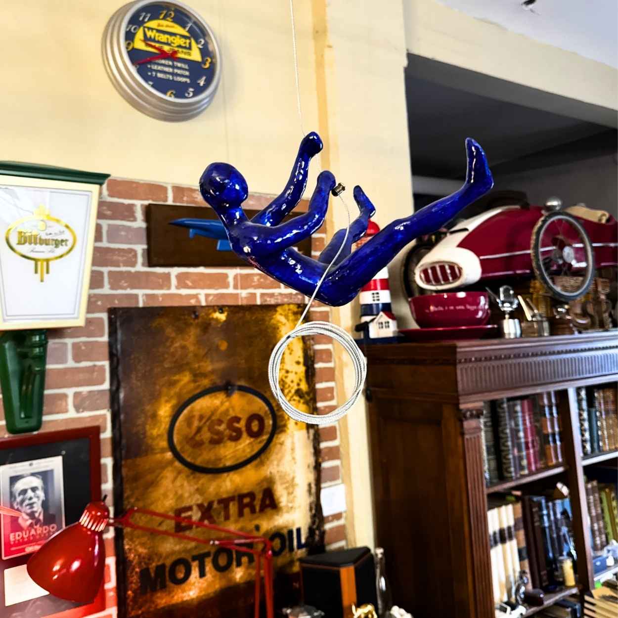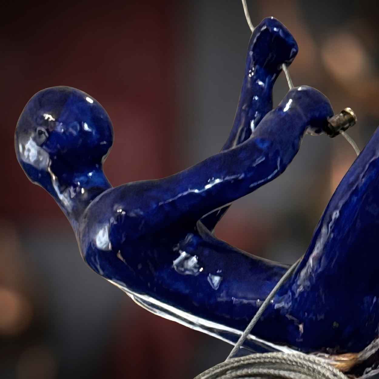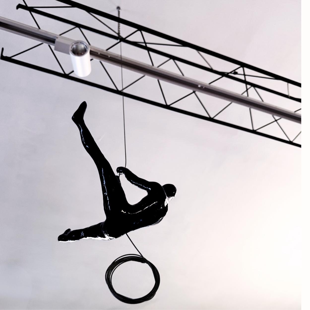 Figura decorativa in resina laccata blu cobalto, caratterizzata da una posa dinamica che riproduce il gesto atletico della scalata. L’oggetto è studiato per l’installazione aerea tramite un cavo in acciaio che attraversa il corpo, eliminando la necessità di basi o supporti a terra. La scultura presenta una muscolatura anatomica definita, enfatizzata da una finitura lucida che genera riflessi netti sui volumi. Il materiale plastico garantisce leggerezza per la sospensione, mentre il contrasto tra il blu profondo della figura e il grigio metallico del cavo conferisce all’insieme un carattere moderno. Alla base della figura, il cavo d’acciaio si avvolge in una…